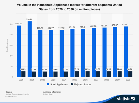 According to Statista, annual sales of small appliances in the U.S. are expected to reach 451 million units by 2025.