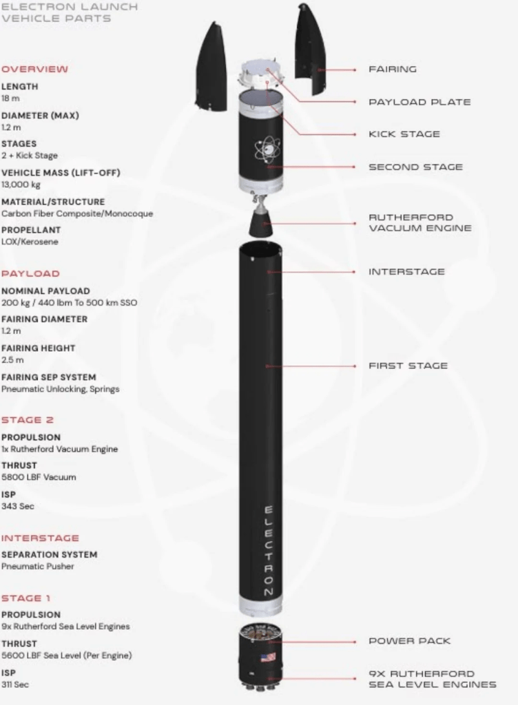 Standing about 20 meters tall, it is optimized to deliver payloads of up to 300 kg into low Earth orbit (LEO). It was the first launch vehicle powered by 3D-printed engines (Rutherford) and built using carbon composite structures, enabling cost-effective, rapid deployment.
