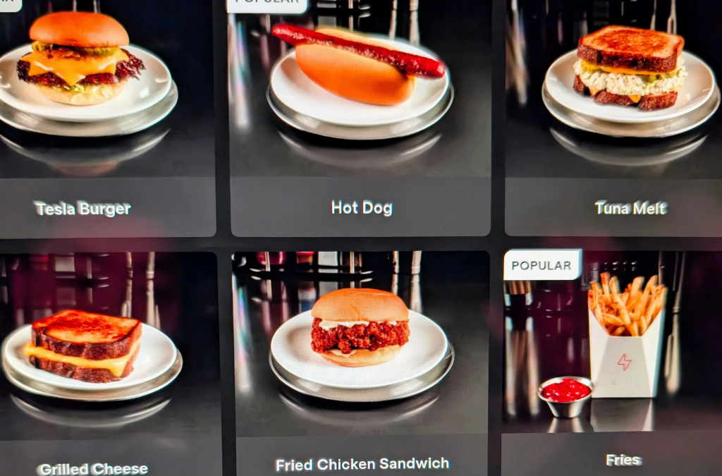 The menu pays homage to the classic American diner—burgers, fries, hot dogs, and milkshakes—while also catering to California’s plant-based culture with vegan and alternative protein options. Orders can be placed through kiosks or the Tesla app, and food is served in Cybertruck-themed trays, adding a playful twist.