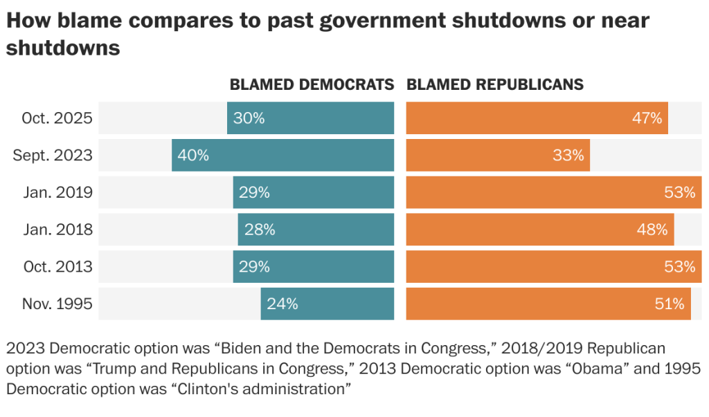 While Republicans control Congress, polls show 47% of Americans blame the GOP for the government shutdown — compared to 30% blaming Democrats.